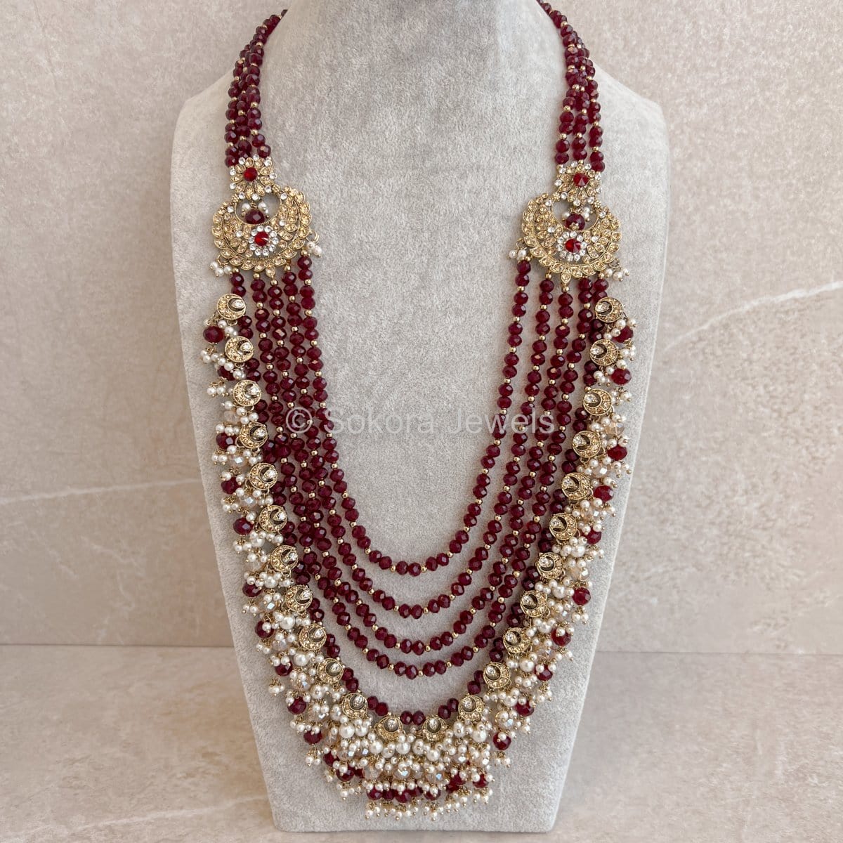 Luxurious Antique Gold Bridal set made up of of golden crystals, thousands of tiny pearls and rich red crystal beads.