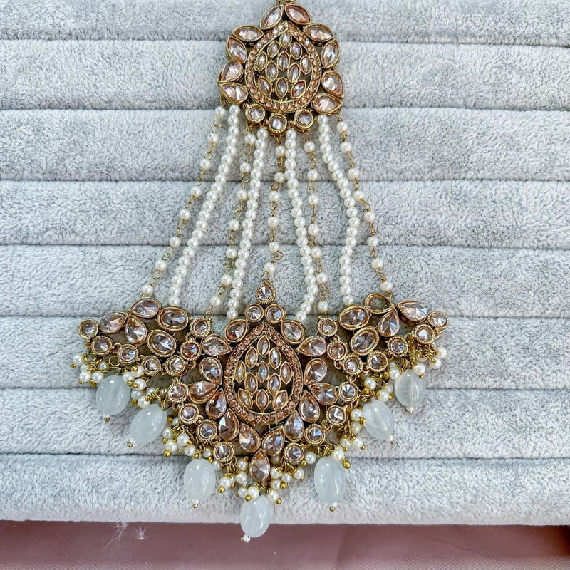 Medium Sized antique gold and champagne zircon jhumar with pale blue glass beads