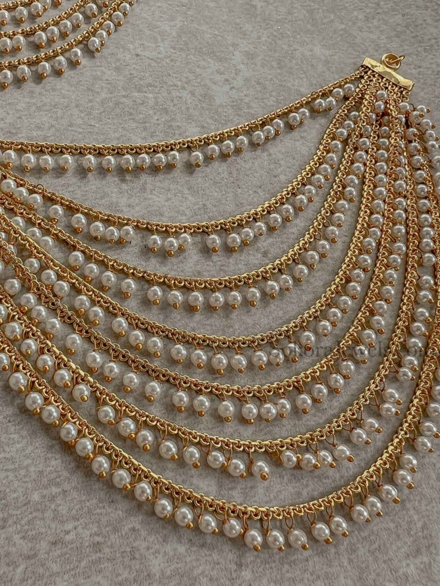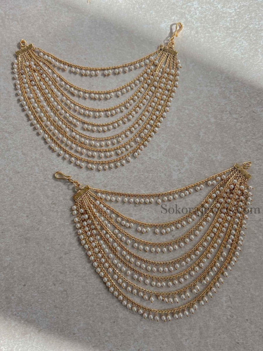Large and Dramatic! Bright gold & Pearl ear chains. Add these easily to any earrings and hook into hair.