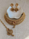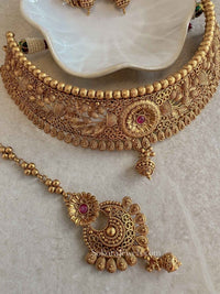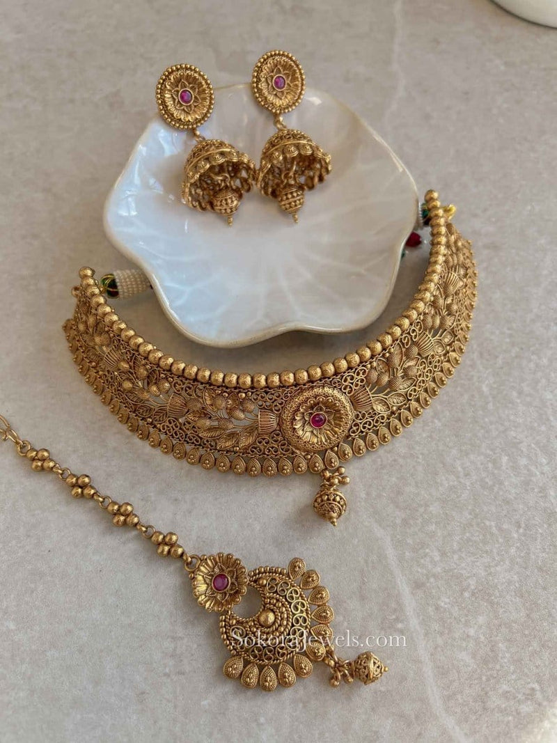 Matt Gold Choker set with matching jhumka earrings and tikka. .