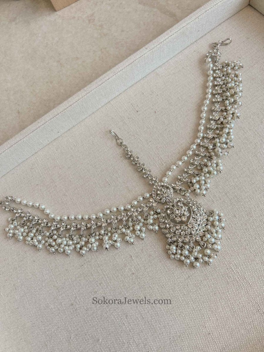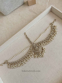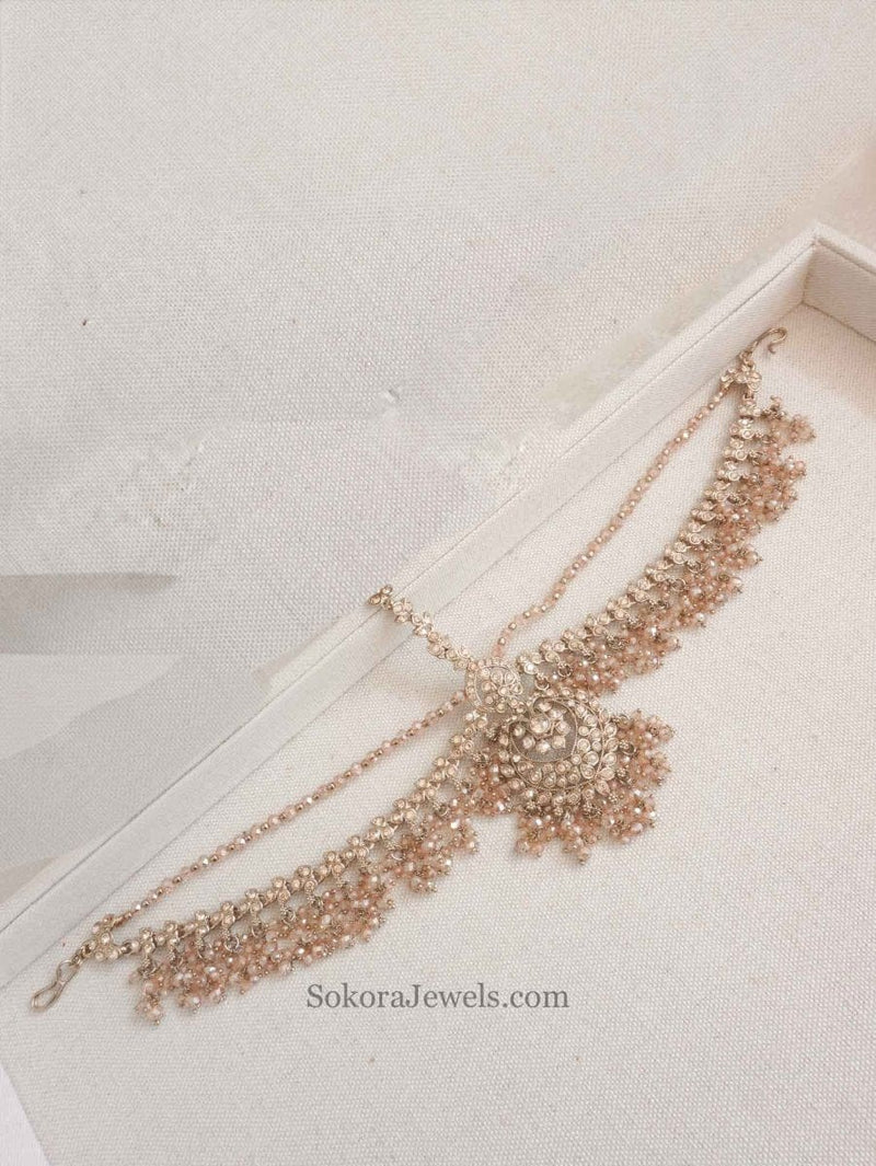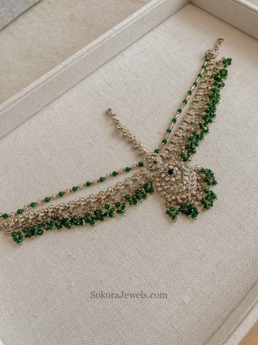 Statement head chain with sparkling crystals and small beads.