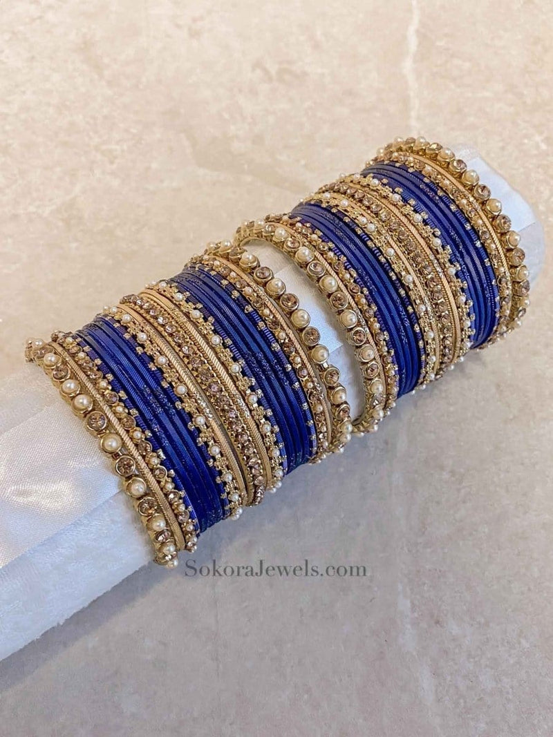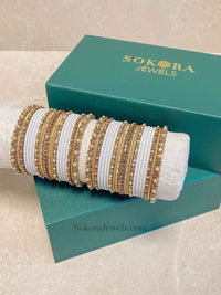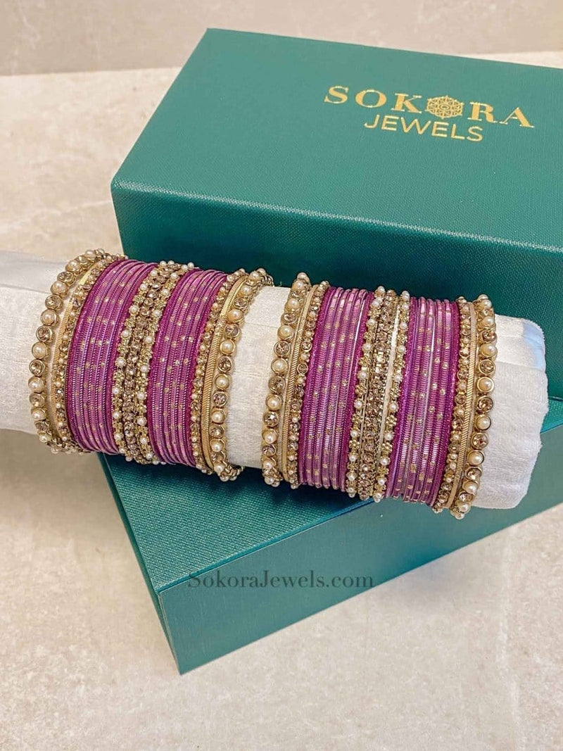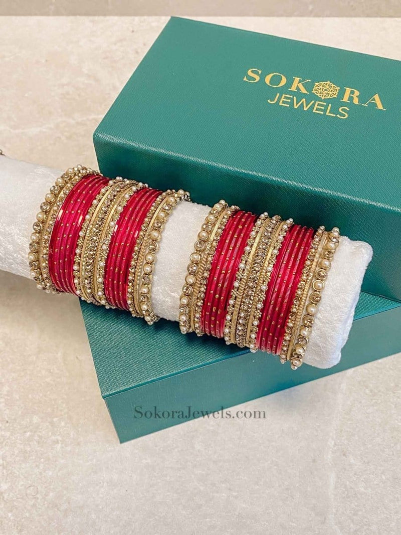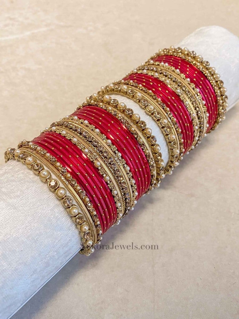 2 Medium stacks of Antique gold, pearl and stonework bangles with pops of colour.