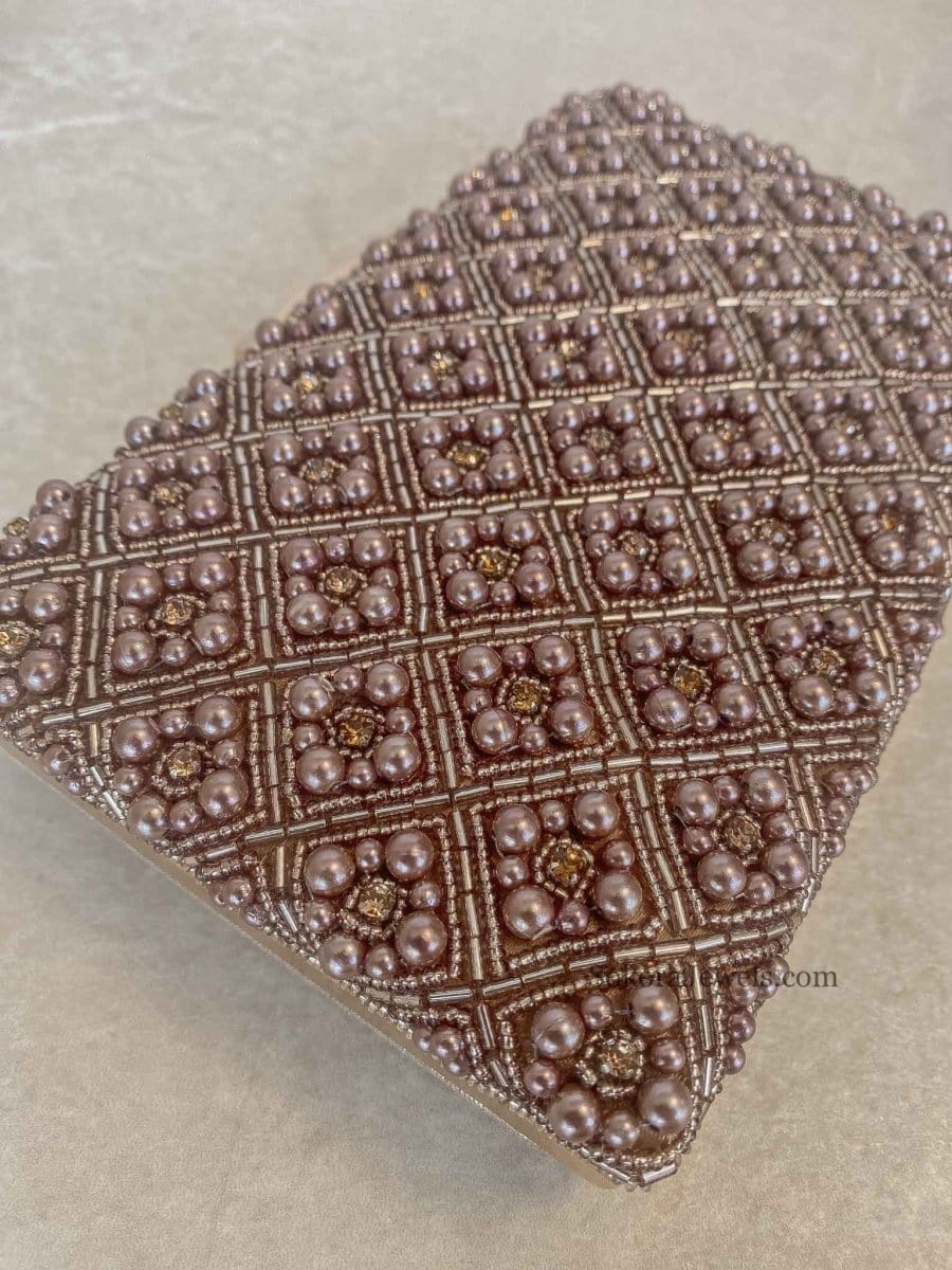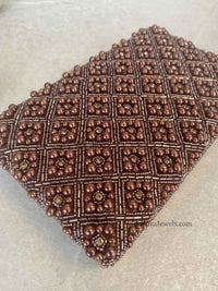 Dark copper brown Brown Pearl bead embroidery detail clutch. Embroidery work on one side only. Large enough to fit all modern smartphones. Perfect for brides!