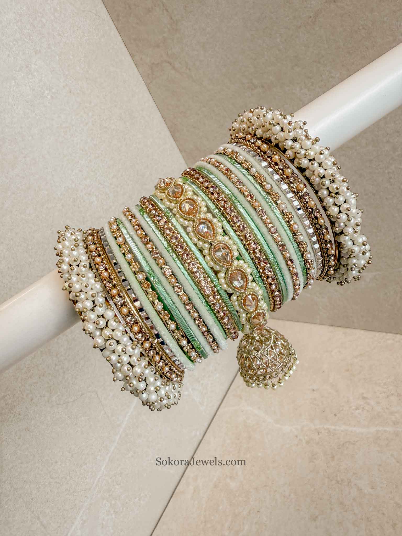 Pair of Large stacks of luxurious Heavy Pearl & Antique Gold bangles with a mix of light mint shades finished with our 'Husna' zircon crystal and pearl jhumka bangle in the middle.