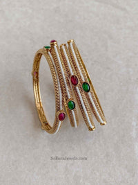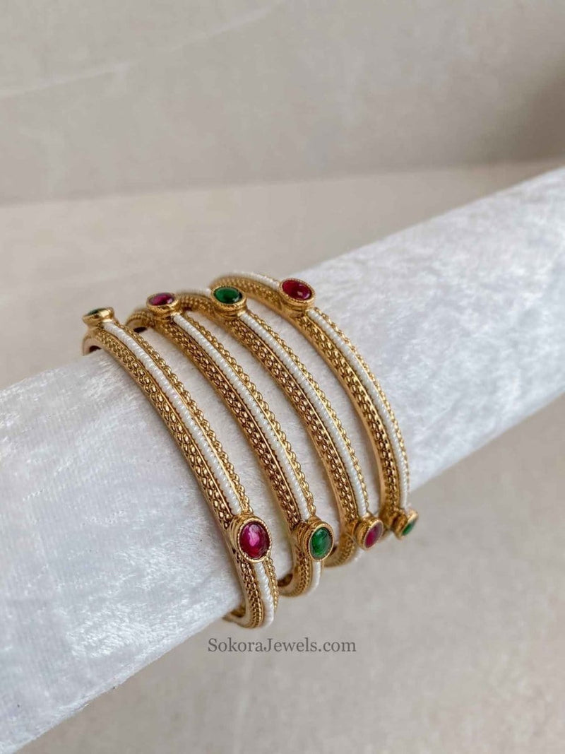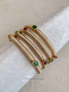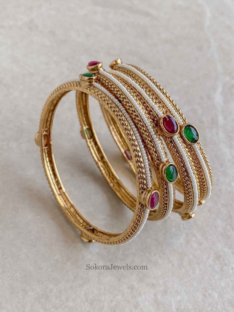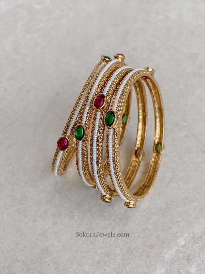 A set of 4 Bright Gold bangles with a mix of ruby and green gem details, finished with a pretty pearl inlay.