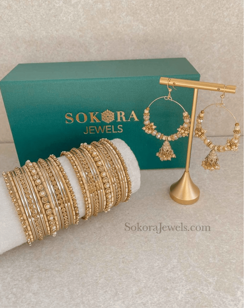 2 small half stacks of antique Gold bangles with matching cute jhumka hoops!