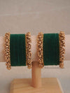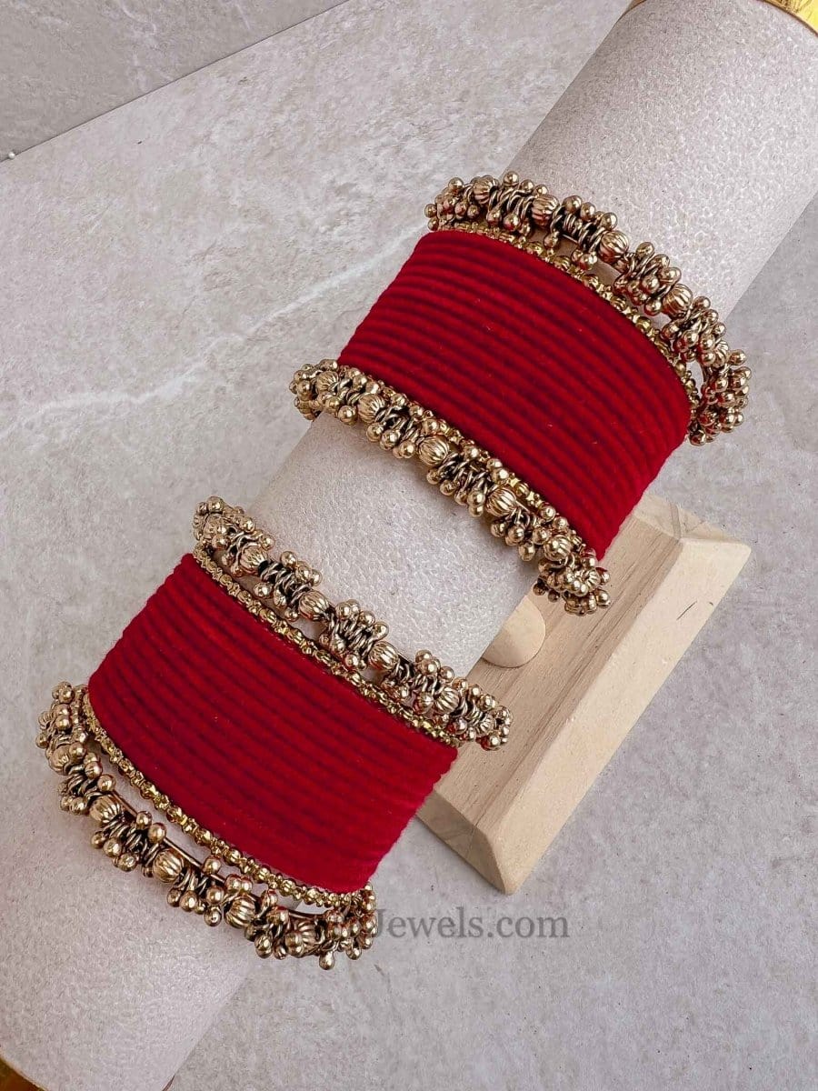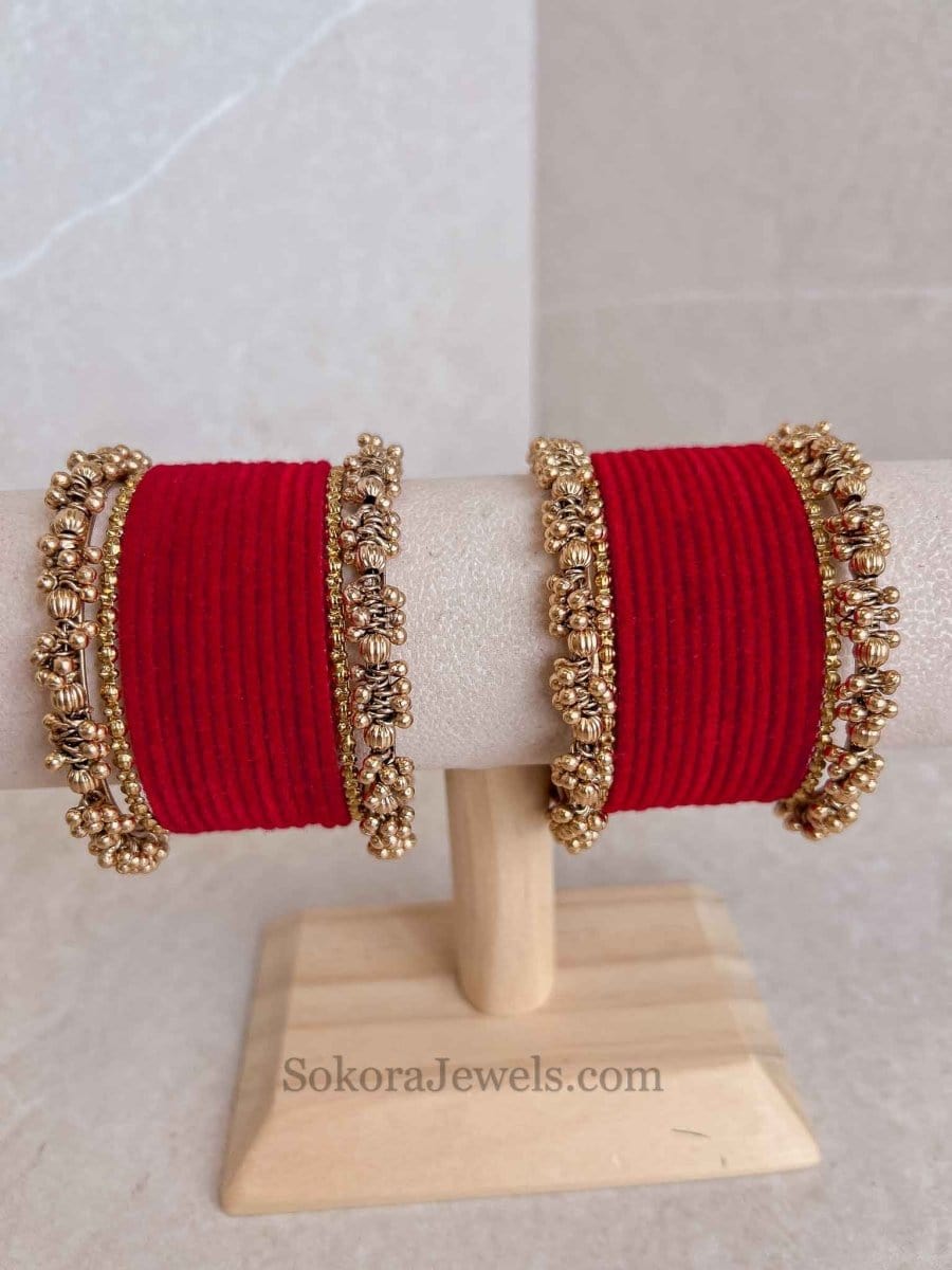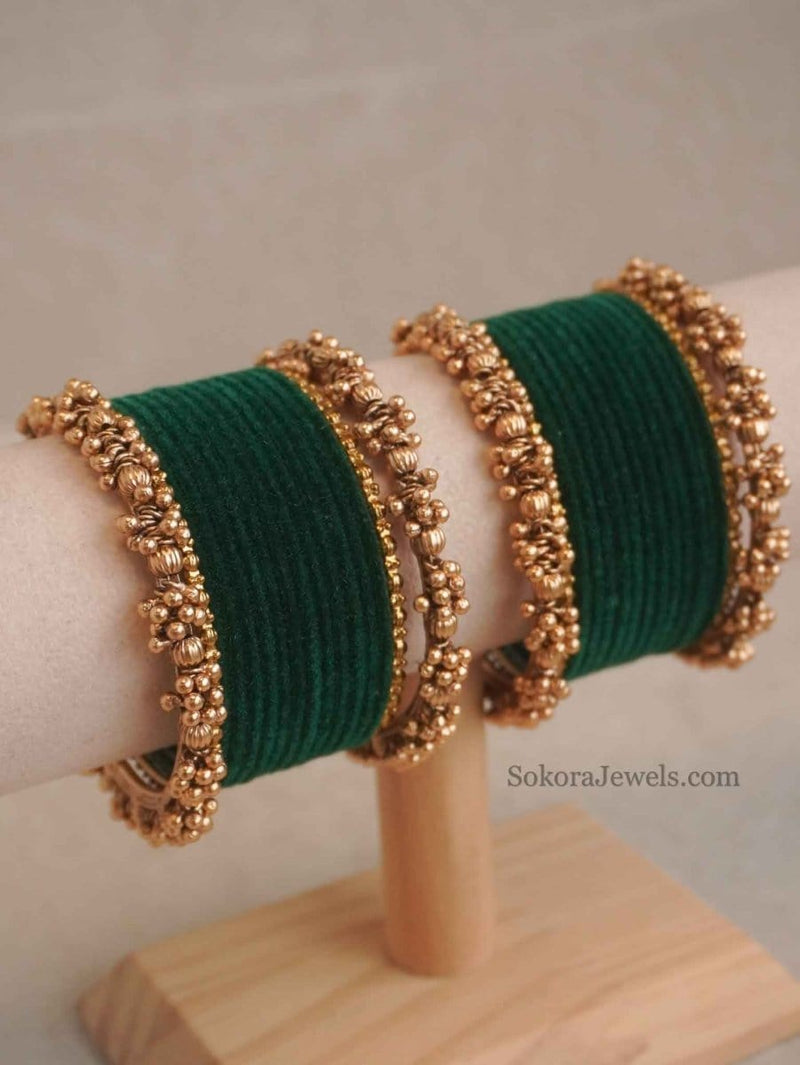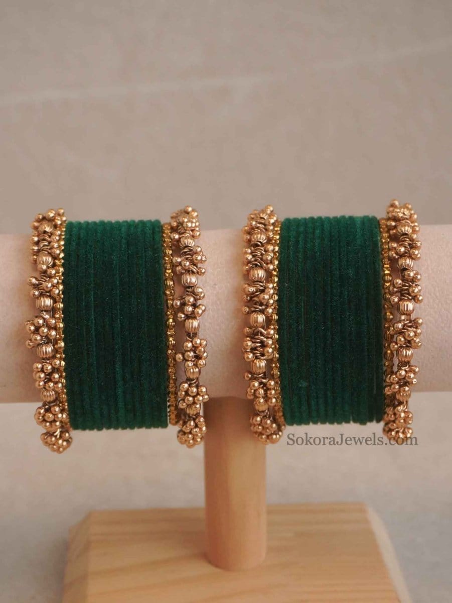 Medium stack of matt gold bangles set with ball beads and velvet fillers bangles.