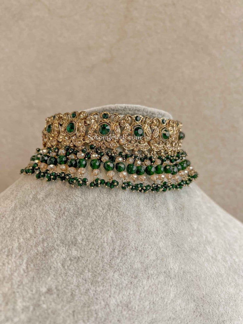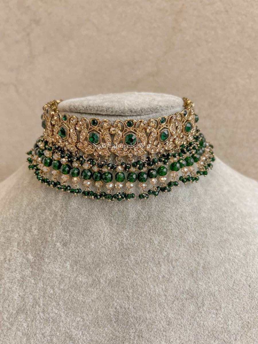 Antique gold flexible choker adorned with sparkly crystals and beads.