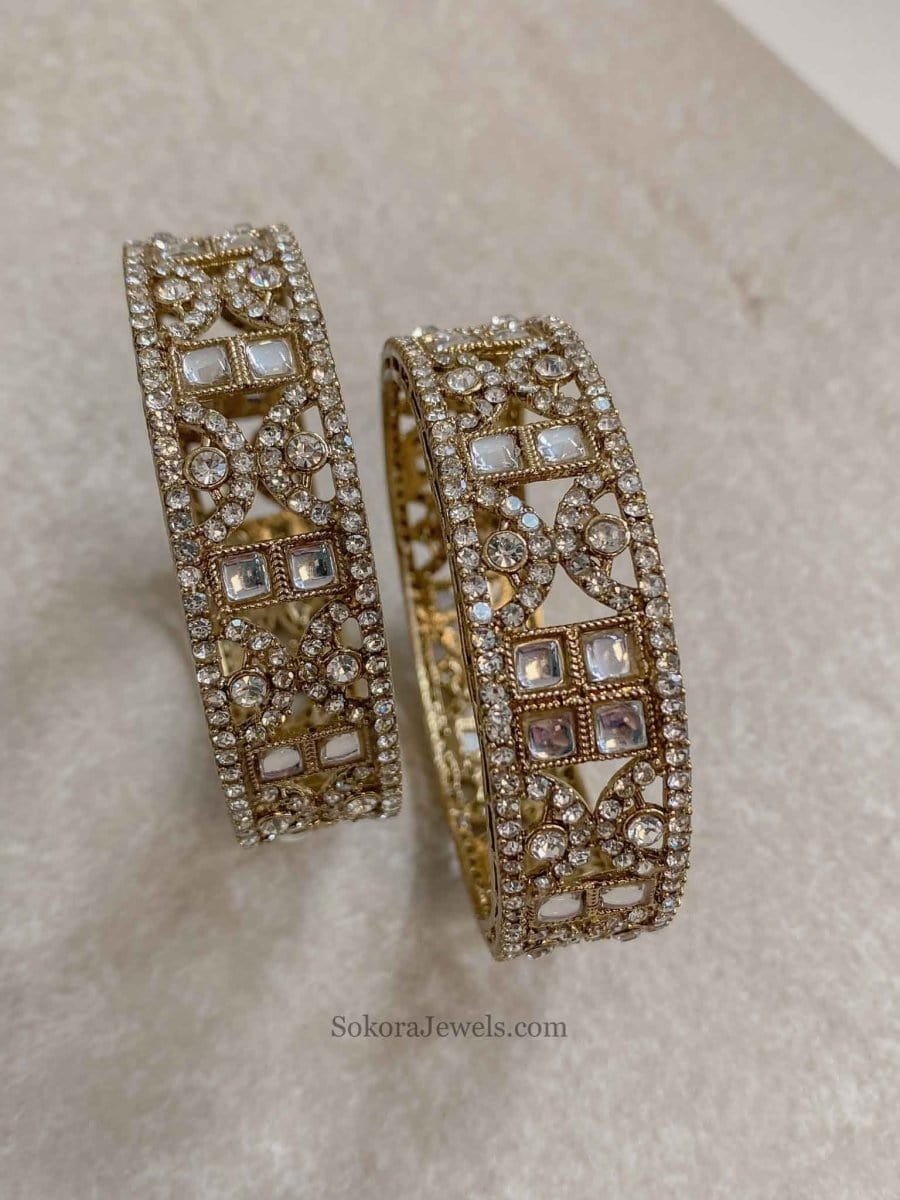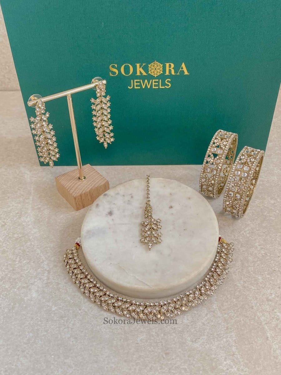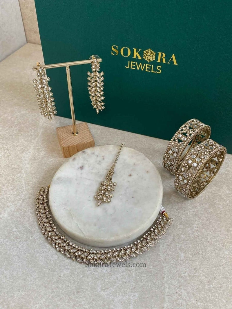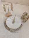 This beautifully presented jewellery set includes our Kajol necklace, earring & tikka set with beautiful matching white velvet, pearl and gold bangles.