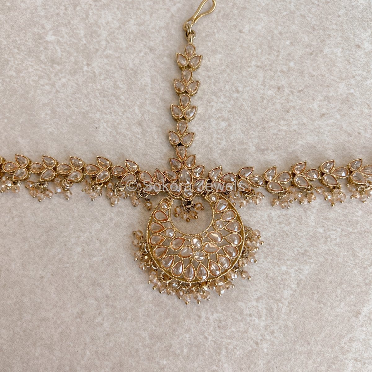 Antique gold and clear zircon crystal bridal choker and necklace set Priya, with matching jhumka earrings and tikka . Finished with faux pearl, light pink and light blue bead and stone work.