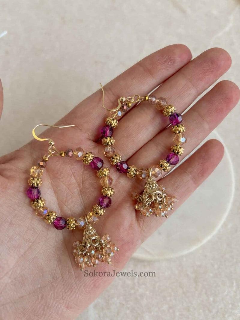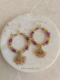 Light weight Jhumka Hoop earrings with purple and champagne beads.