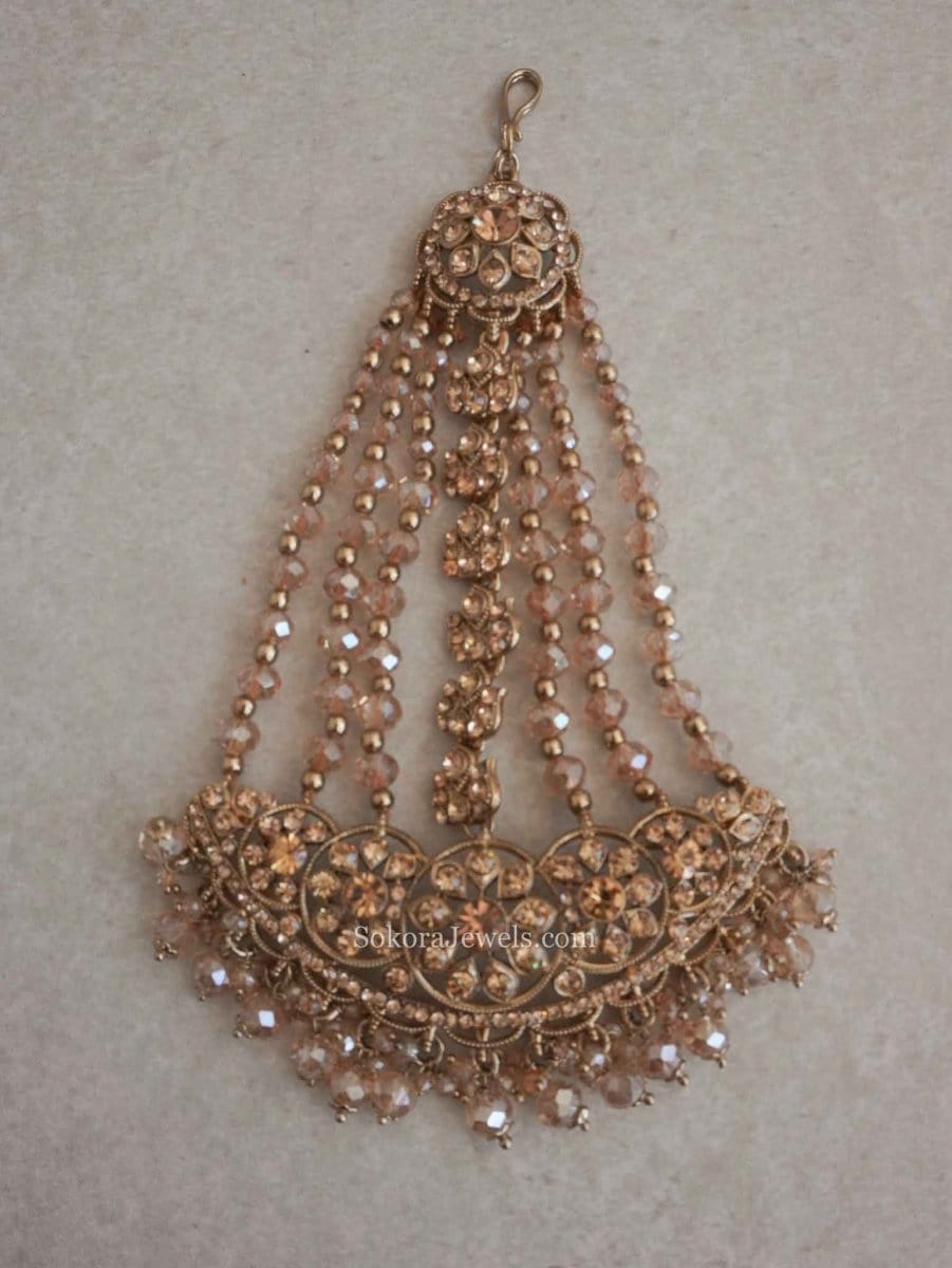 Fluid antique gold jhumar with golden crystals and tonnes of champagne crystal beads