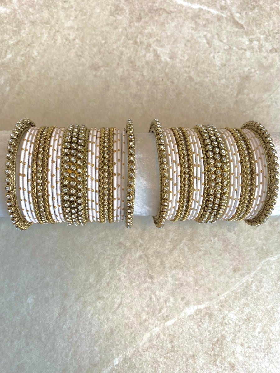 A full Sized Bangle Set for Both Arms with clear stonework mixed with an off white and gold dot bangles. (off white has a very slight peachy tone)