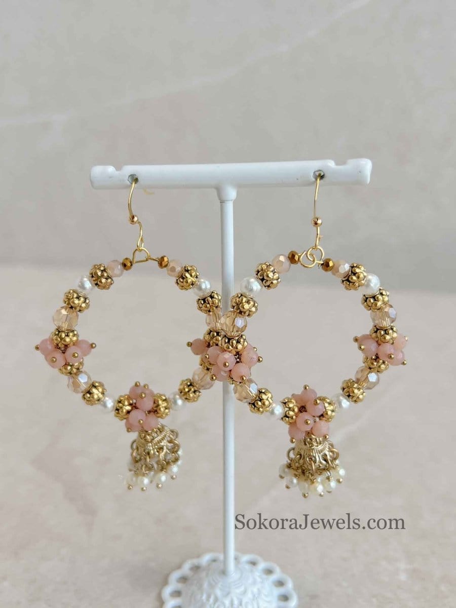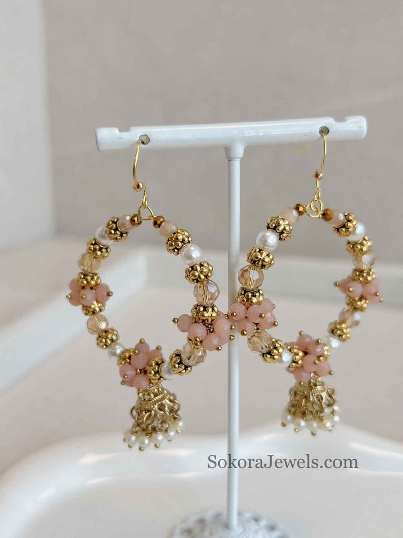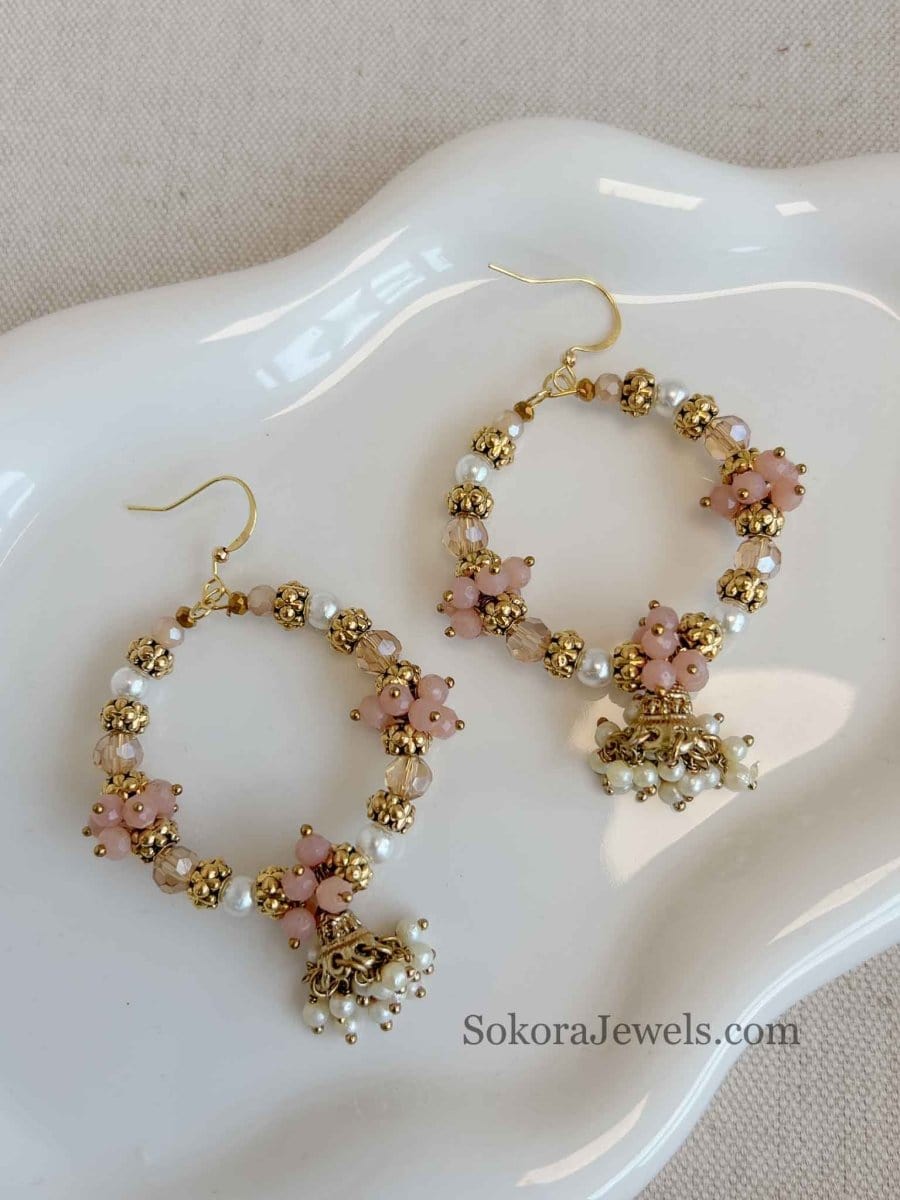 Antique Gold Hoop earrings with pearl and dark green beads.