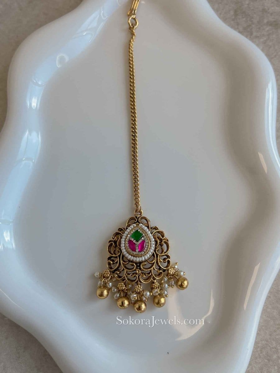 Matt gold and Kundan tikka with ruby and green gems. Finished with Diamante work and gold ball beads.
