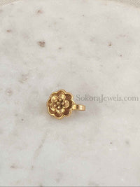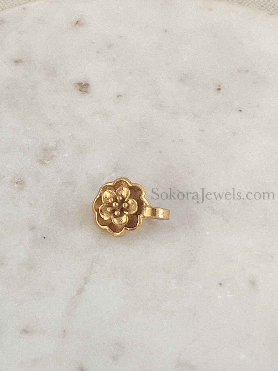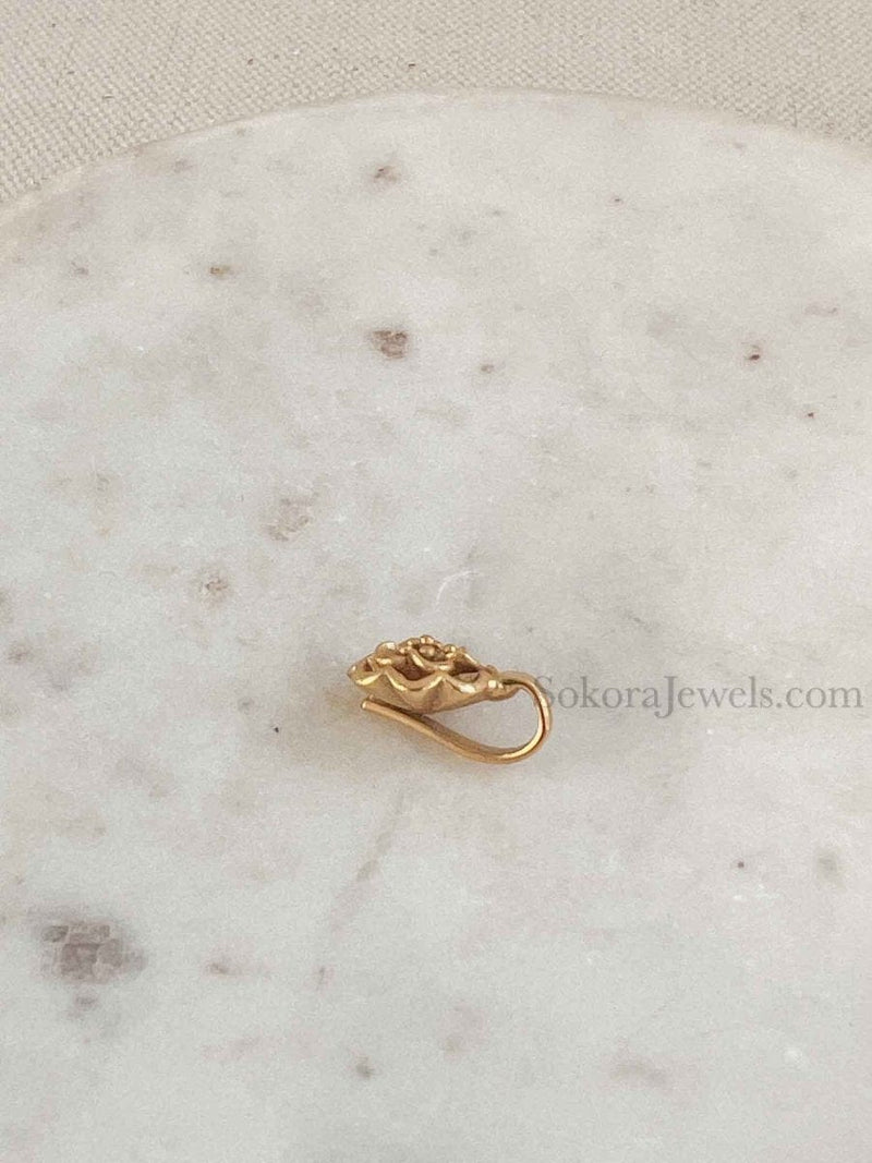 Small Bright gold nose pin in a pretty floral design, only 1cm wide.