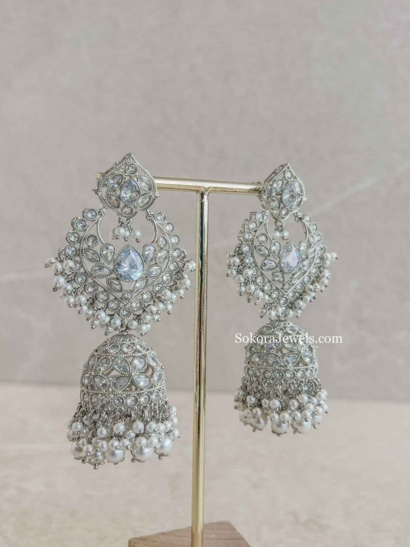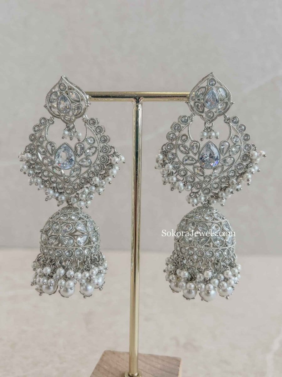 Silver long Jhumka Earring and Tikka set with golden crystals and champagne pearls.