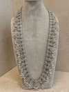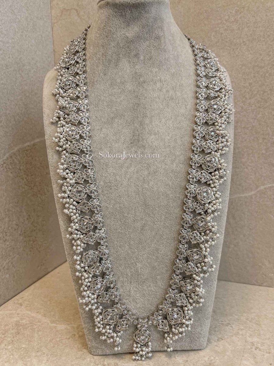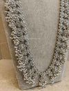 Silver Long Necklace with clear zircon crystals and white pearl beads.
