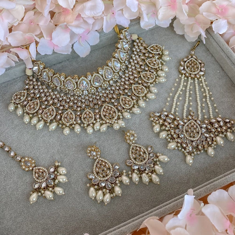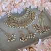 Antique Gold polished Tahia choker and necklace set made up of of clear zircon crystals and off white pearl beads.
