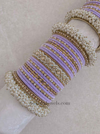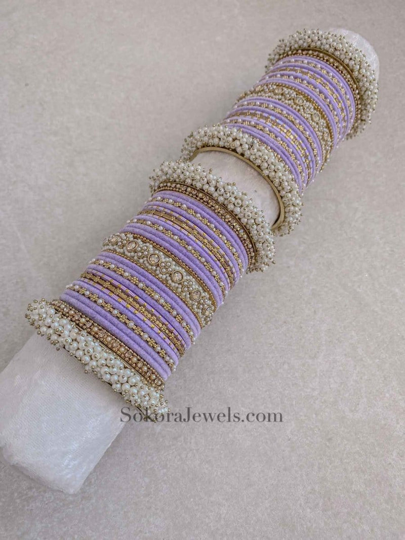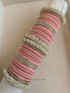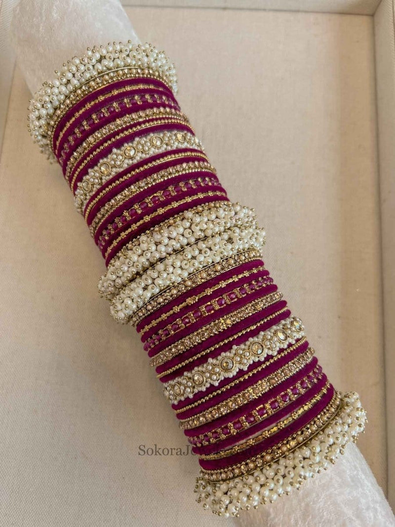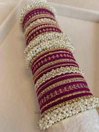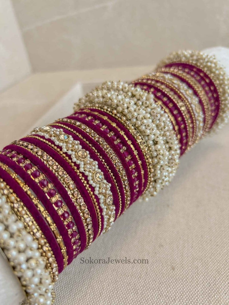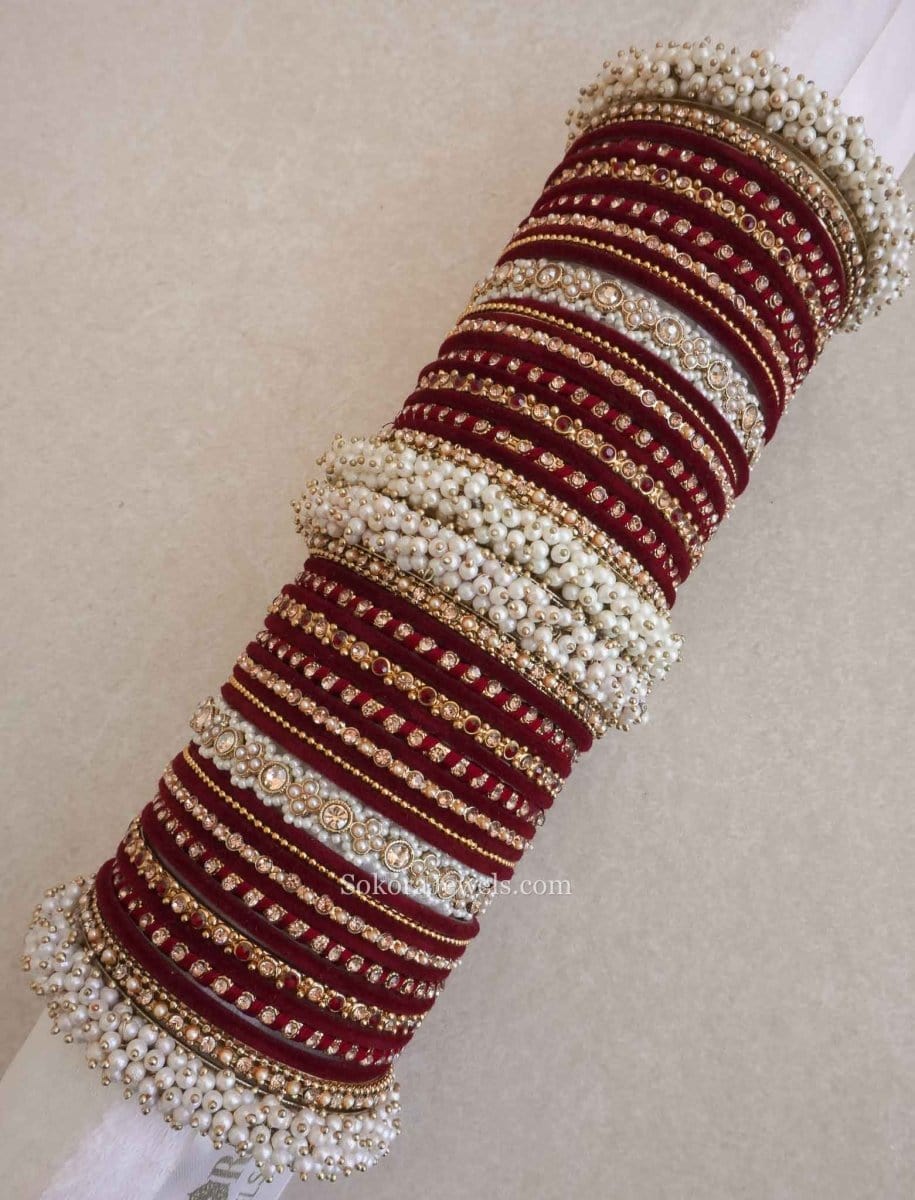 Large stack of maroon velvet bangles with pearls, golden crystals and antique gold. Sold as 2 arm set only.
